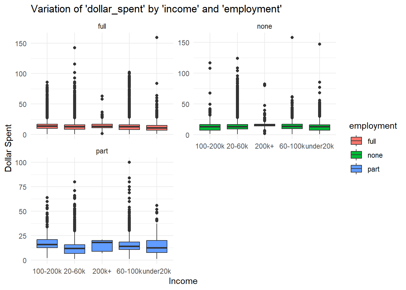 Provide both (1) ggplot code and (2) a simple comment to describe how ‘dollar_spent’ varies by ‘income’ and ‘employment’.