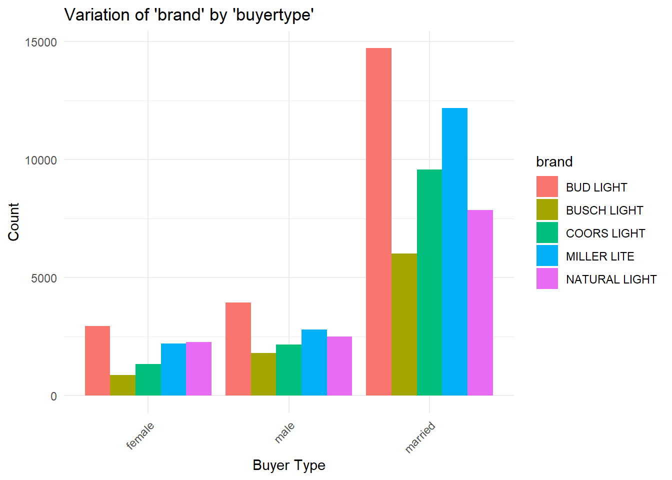The bar plot illustrates the distribution of ‘brand’ across different ‘buyertype’ categories in the beer markets dataset. Some interesting findings that I wanted to mention were that Bud Light was the most bought type of beer amongt all the buyer types, whilst Bush Light was the least bought.