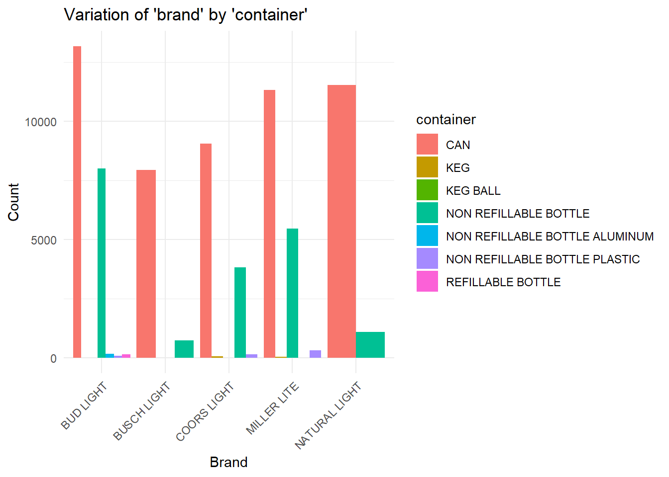 The bar plot displays how ‘brand’ varies based on the ‘container’ type in the beer markets dataset. Some analysis of the chart shows us that most beer brands manufacture using cans as their predominant container of choice, while a non refillable bottle is a decent secondary option.